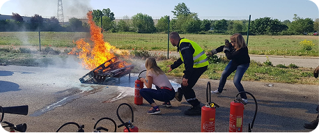 - Maniement d’un extincteur (avec bac à feu si présentiel)